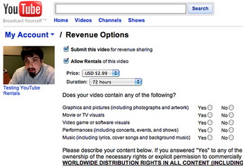 Некоторое время назад YouTube представил бета-версию новой функции видеопроката (с оплатой за просмотры). Для того, чтобы ею воспользоваться нужно сначала выбрать в качестве способа заработка опцию «Прокат видео» (Rent Video) и затем выбрать стоимость проката видео (Price for rental) и его срок действия (Duration of rental). Наконец, надо отправить заявку на добавление выбранного видео в прокат на YouTube. После удачного добавления, пользователям, желающим посмотреть это видео, придется заплатить за просмотр.