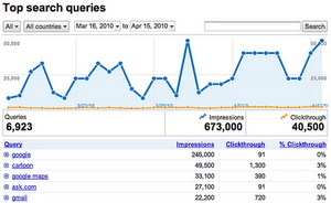 добавил новую функцию в Google Webmaster Tools - отчет по Популярным Поисковым Запросам, по которым пользователи наиболее часто попадают на сайт (