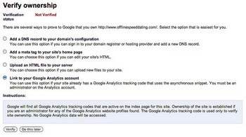 объявил о новом способе верификации сайта в Google Webmaster Tools - с помощью кода Google Analytics. Сам процесс достаточно простой: нужно установить код на сайт, затем перейти в Google Webmaster Tools и верифицировать ресурс.