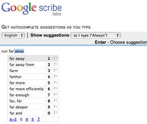 Google Scribe – новый сервис Google, который предлагает вам слова по мере того, как вы печатаете. Это не подсказки ключевых слов в поисковом запросе, это отдельный сервис, который предназначен для написания текстов с автоматическим подбором слов, словосочетаний и даже предложений. Чтобы выбрать нужное ключевое слово или фразу, достаточно кликнуть на него или нажать соответствующую цифру. На данный момент Google Scribe работает только на английском языке.